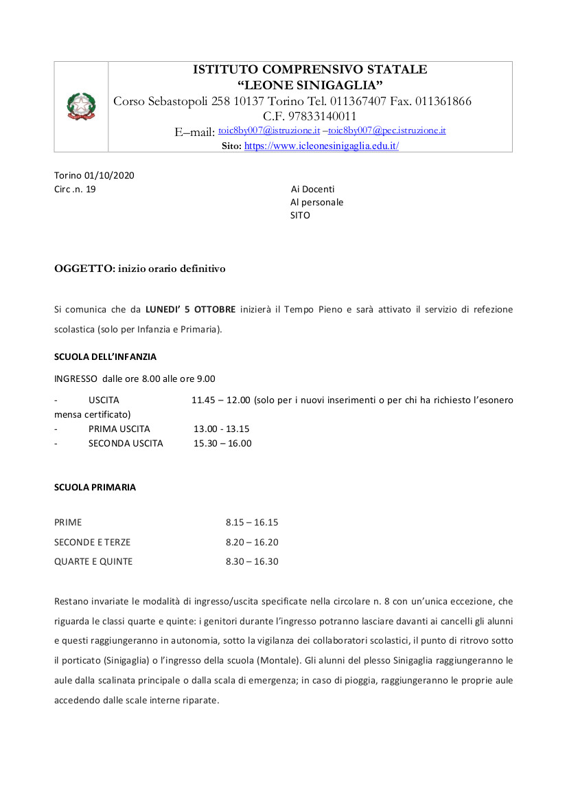 • Il personale Assistente Amministrativo osserverà un orario che sarà predisposto dal DSGA sulla base  delle esigenze del servizio; sarà sempre possibile contattare gli uffici allo 011-01167890 tra le 9,00 e  le 13,00 oppure inviando una mail a Questo indirizzo email è protetto dagli spambots. È necessario abilitare JavaScript per vederlo.; il ricevimento al pubblico sarà  possibile solo per attività indifferibili e previo appuntamento.