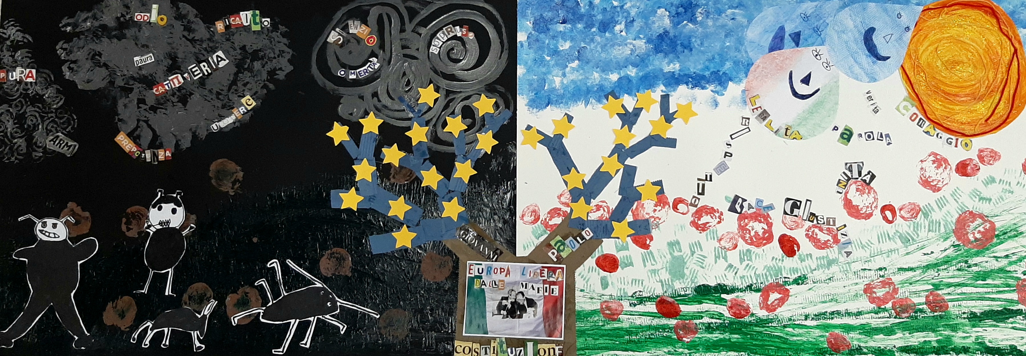 Concorso per il XXIX Anniversario delle stragi di Capaci e via D'Amelio. Elaborato realizzato con tecniche del metodo Munari dai bambini di 5 anni delle sezioni A/E affrontando le tematiche della Legalità, Giustizia, Costituzione, Libertà, Unità, Accoglienza, ed imparando a conoscere le figure di Giovanni Falcone e Paolo Borsellino e il loro impegno a combattere cattiveria, prepotenza, paura, odio, silenzio, omertà....con coraggio.